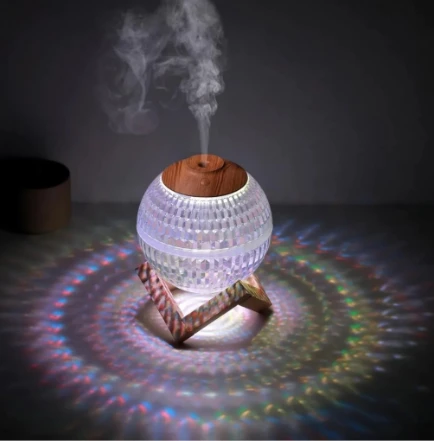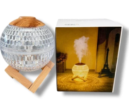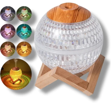 Este humidificador combina diseño moderno con funcionalidad total. Su cuerpo esférico con acabado tipo cristal y su base de madera lo convierten en un objeto decorativo único que además mejora la calidad del aire. Ideal para el hogar, la oficina o tu espacio de descanso.