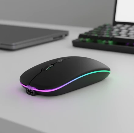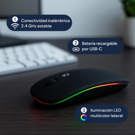 Mouse inalámbrico con batería recargable y retroiluminación LED multicolor. Diseñado para ofrecer un control preciso y conexión estable por tecnología inalámbrica de 2.4 GHz.