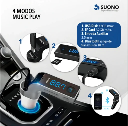 Transmisor FM de coche con Bluetooth - Frecuencia FM: MHz - Pantalla LED - Botón independiente para inicio/apagado de Bluetooth - Reproducción de música a través de USB y tarjeta micro SD (hasta 32GB) - Formatos de música compatibles: MP3, WMA - Funciones de llamada: responder, colgar, rechazar, volver a marcar mediante Bluetooth - SNR: Más de 60dB - Grado de distorsión: Menor que 0.1% - Respuesta de frecuencia: 20Hz a 15KHz - Voltaje de trabajo: 12V a 24V - Límite de Voltaje: 9 a 26V - Salida USB: 5V 1A - Temperatura de operación: 0 a 50 grados centígrados - Alcance de transmisión Bluetooth: 10 metros - Bluetooth 2.1 + EDR - Procesamiento de sonido Bluetooth con función A2DP - Distancia efectiva del micrófono Bluetooth: 0-2M - Modo FM: Bloqueo de frecuencia de PLL digital estéreo - Tecnología de cancelación de eco y reducción de ruido (CVC)